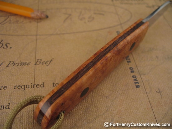 Hiroaki chose some beautiful Stabilized Quince Wood for the handle scales that are well matched with Rich color and wonderful Grain. Black Micarta Pins add a dramatic look.
