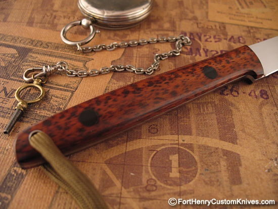 Hiroaki chose some beautiful Stabilized Snake Wood for the handle scales that are well matched with Rich color and wonderful Grain. Black Micarta Pins add a dramatic look.
