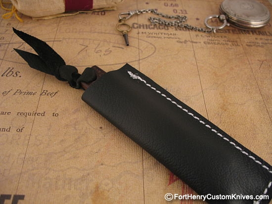 Hiroaki makes his own Leather Pocket Sheaths for every knife, well stitched and holds the knife securely. This knife comes with a Black Leather slip sheath. IMG_6137_opt