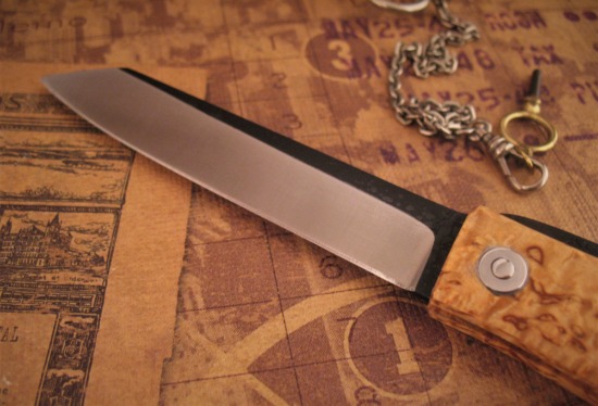 At the last show, Hiroaki brought me just a few of this XL Friction Folder ~ each is Hand Made and Signed on the Frame. These are also special in that Hiroaki used Rich Curly Birch for the Handle and tough D2 Steel for the Blade!