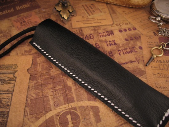 Hiroaki makes his own Leather Pocket Sheaths for every knife, well stitched and holds the knife securely. This knife comes with a Black Leather slip sheath.