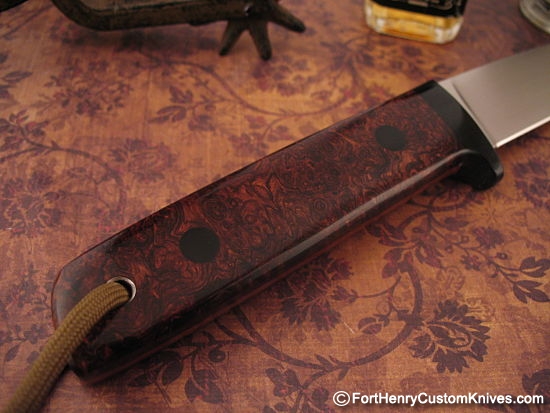 For the handle scales Hiroaki chose Gorgeous Stabilized Bolivian Rosewood Burl with Beautiful Natural Grain and Rich Color. The handle has unique, Hand Filling contours, the Guard and Bolt Covers are tough Black Micarta.