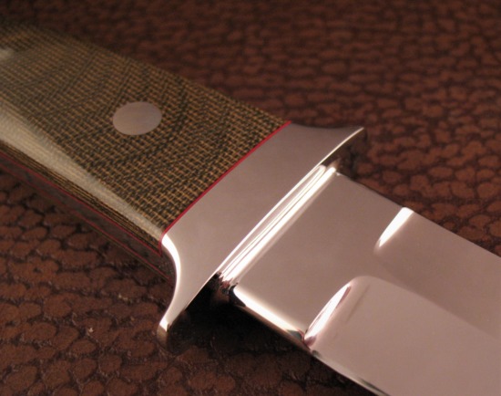 The Tang is Steeply Tapered to reduce weight. The thin Red Liners are a subtle touch and help to accent the Green Micarta.