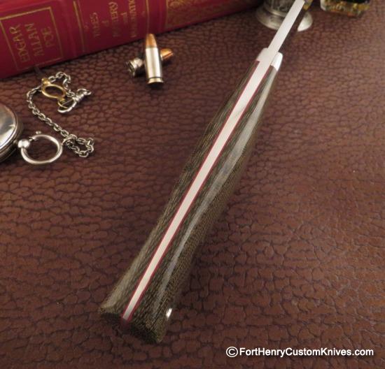 No detail is out of place on this knife, the Tang is Steeply Tapered to reduce weight and the Handle Scales are Custom Contoured for a very Comfortable Grip. The thin Red Liners are a subtle touch and help to accent the Handle Material.