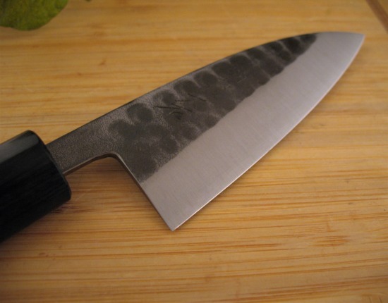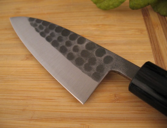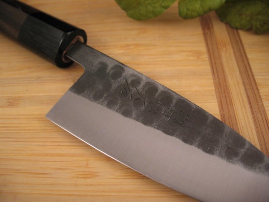 The Kurouchi Finish adds an extra layer of protection against rust, but also the Hand Hammered Flat area assists food in Releasing from (rather than sticking to) the blade after cutting.