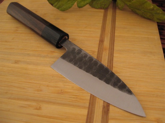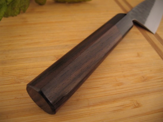 Each Hiragatake blade is Hand Forged using a San-Mai technique – Hard Japanese Carbon Steel forms the cutting edge and is sandwiched between softer layers (cladding) of Stainless Steel. This technique provides incredible Performance with the Reduced Maintenance that most appreciate. This example is a Wide Petty Knife ~ the Japanese equivelant of a small Paring Knife.