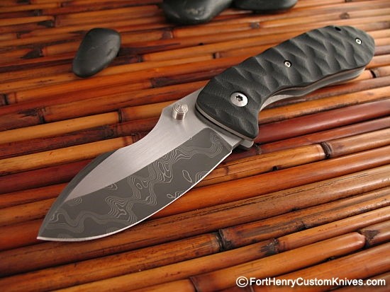 This is Jared’s upscale Dodo Framelock folder in some very special blade material.  The blade was hand ground from Chad Nichols Stainless Blackout Damascus.