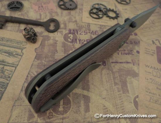 The Custom Titanium Clip is Blackened and set for Discreet, Low Riding / Tip Up carry.