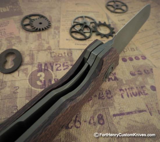 Even thought it is labeled a Mini ~ this is still a substantial knife (not too bulky or too thick). The Titanium frame and Blade have a Custom Acid & Stonewashed finish and the size makes for a very Comfortable Full Grip. The instantly recognizable Bowie Shaped blade was Hand Ground from Thick CPM154. The Ambidextrous Thumb Studs are Blackened Titanium.