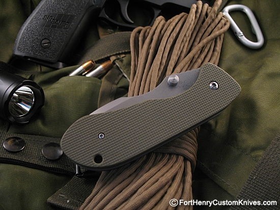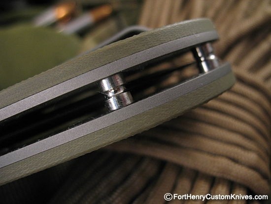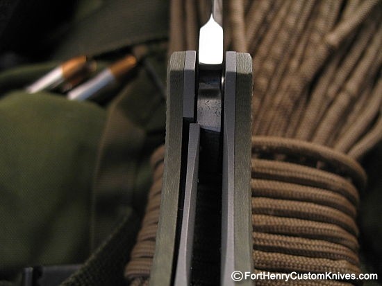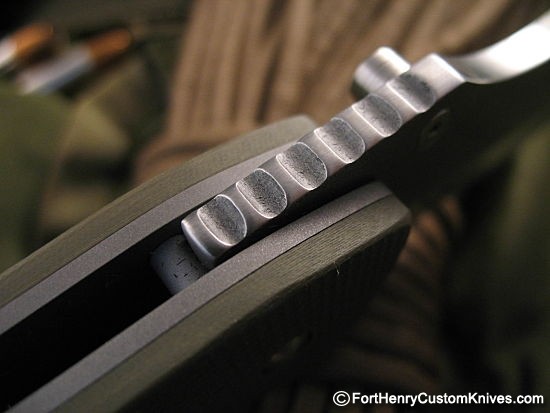The thick Titanium frame is overlayed with stippled G-10 Scales for a very secure full grip. The RH Thumb Stud is perfectly placed to allow easy opening. The Crucible CPM 154CM blade has a Two Tone finish ~ the Flats have been given a Rustic working finish and the Bevels were Hand Sanded to a high Satin Finish.