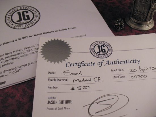Jason takes great care with the Heat Treatment of all his blades, using a Vacuum Heat Treat with Sub Zero Quench and provides a Rc Certificate of Testing with each knife.