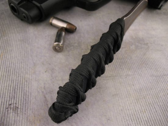 The handle is Double Cord Wrapped with Two Colors of Japanese Cord, Blue and Black. The Top of the Full Tang area has a small Thumb Ramp.