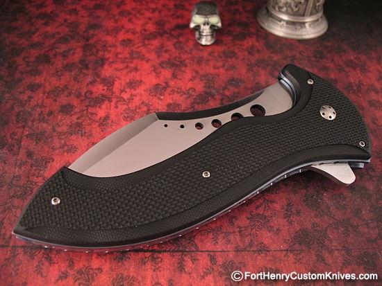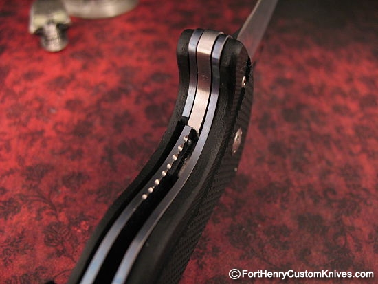Fully contoured G-10 handles, Deeply Milled with Stippled Texture, precision fit to the Titanium Frame. The toughest in materials for this powerhouse Flipper!