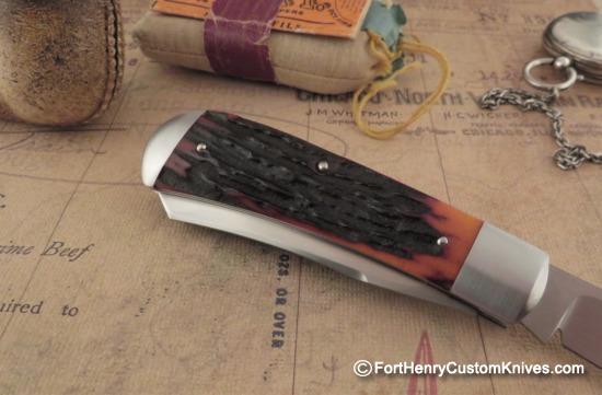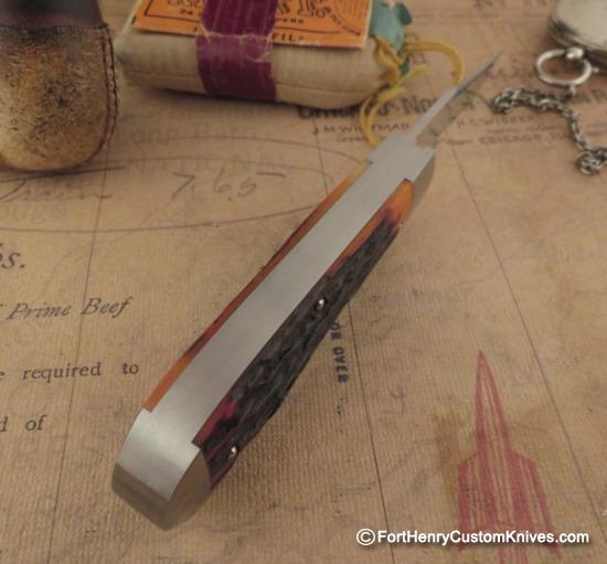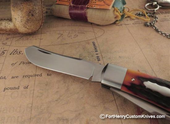 The Stag on this Jim Dunlap Trapper has deep Gnarly Natural Texture, is Custom Contoured and the overall knife is so Clean that you cannot feel any Seam from the Inlay, Pins or Bolsters. Both Blades have a Labor Intensive Hand Rubbed Satin Finish and a very High Hollow Grind with a Custom Swedge.