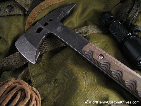 The blade of this one of this tough piece is 3/8" Thick A2 Steel, the thickest steel I have seen – professionally Heat Treated by the Master, Paul Bos and given a double Stonewashed finish. The Backside Breacher and thick Pry Bar Tip are a couple of the extra features.