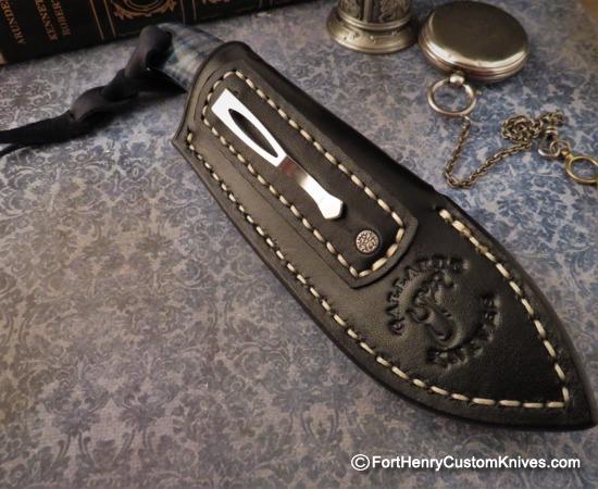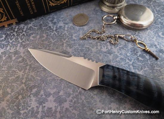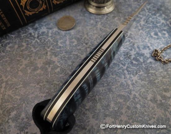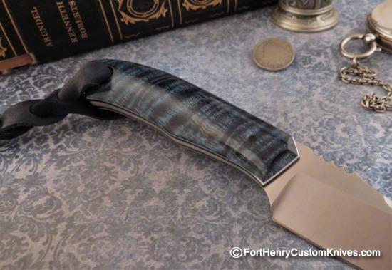 Joshua chose some Beautiful Quilted Maple for the handle Handle Scales. They show wonderful Chatoyance when rotated back and forth in the light, cut from the same block ~ they are perfectly matched. This one also comes with a Custom Blue Leather Lanyard.