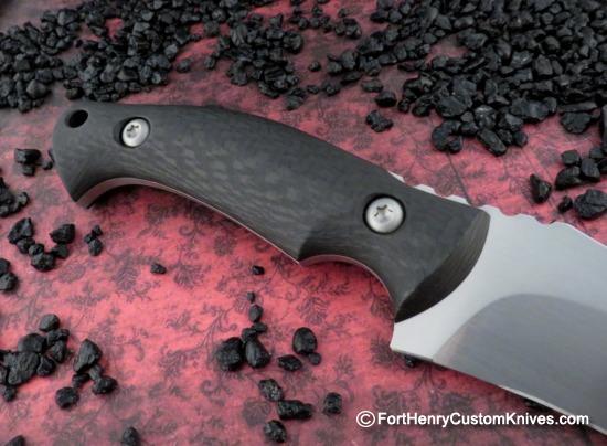 The Custom Handle scales are thick, Contoured Carbon Fiber. The Ergonomic shape molds to the hand and makes the knife feel like an extension of your arm.