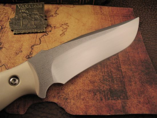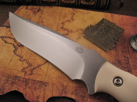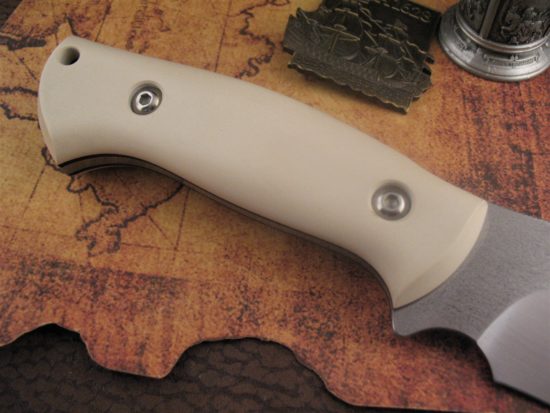 The Custom Handle scales are Thick, Deeply Contoured Ivory Micarta. This material will slowly take on the Appearance of Fine Old Ivory over time.