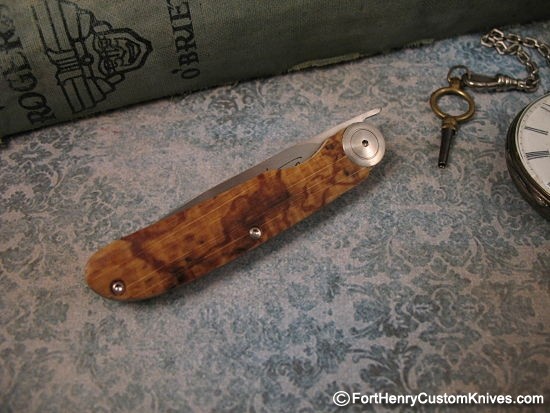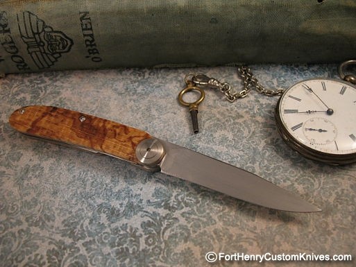 The rich Curly Maple is perfectly matched, each side has deep color and lots of grain. The blade floats open but still has a perfect detent, the lock engages with a gentle sound and there is absolutely no play anywhere in the knife.