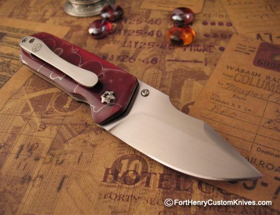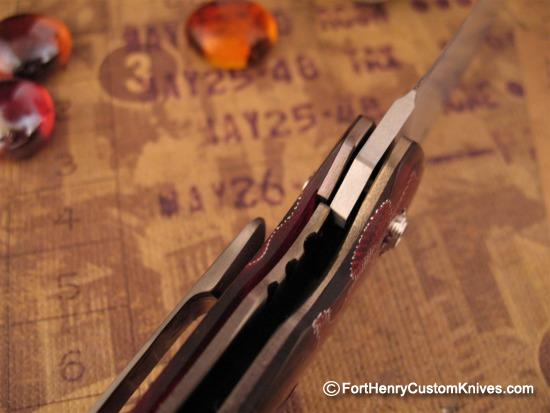The eye catching handle scales are a Beautiful Raffir Noble “Crimson Wave” Composite with Aluminum Matrix over a Full Titanium frame. The Action is extremely Smooth due to the Internal Bearings ~ for those that enjoy “Flicking” a Knife open with their Thumb or Finger, this knife is very easy to accomplish that action.