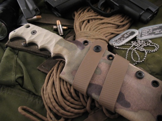 The Matching Custom Camo Kydex Sheath has an Adjustable Snap Loop Carry System.