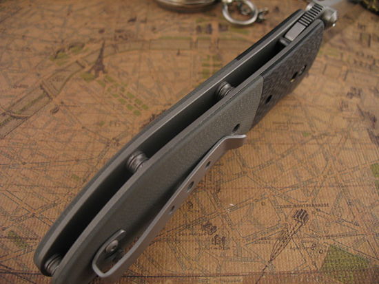 This is a tough full sized Tactical with wonderful ergonomics! The Titanium Frame is very thick and the handle scales are contoured Linen Micarta with Precision Fit Carbon Fiber Bolsters.