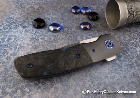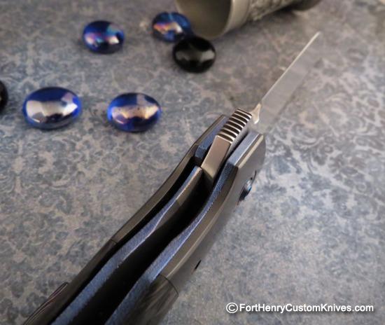 The Thick Textured, Anodized Ti Liners on this Lambert Seishin are overlayed with Fat Carbon “Dark Matter” Carbon Fiber and the Zirconium bolsters fit so precisely that it appears to be one piece ~ you cannot even feel the joint. This example also features a Custom Fat Carbon Backspacer.