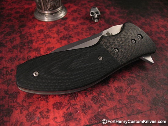 This is a tough full sized Tactical with wonderful ergonomics!   The Titanium Frame is very thick, it has a uniform Bead Blast finish and it is overlayed with Black Linen Micarta that has some great looking grain.  The Micarta is precision fitted to the Lightening Strike Carbon Fiber bolsters so well that it appears to be one piece ~ you cannot even feel the joint.