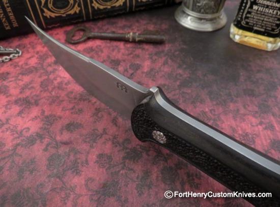 Mariano Yannoni is clearly a Maker who enjoys Hand Crafting Solid Working knives ~ from Custom Fixed Blade Hunters to Robust Friction Folders. This is an Elegant but Wicked Boot Knife. Hand Crafted with a beautiful Textured Ebony Handle and Hand Forged 1095 Steel Blade.