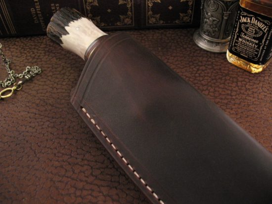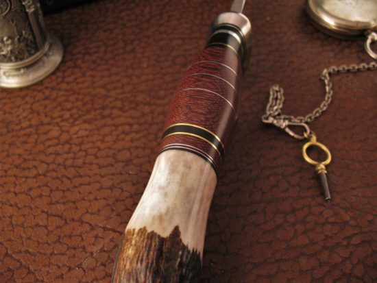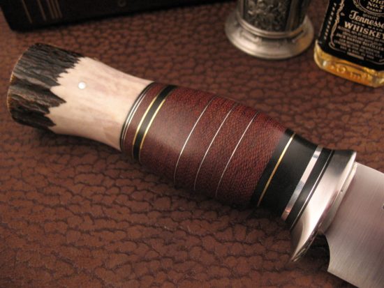 Gorgeous Sambar Stag Handle and Custom Stacked Leather Handle with alternating Aluminum, Black G-10 and Brass Spacers. Mike takes great care to Contour his handles for a Very Comfortable and Secure Grip.