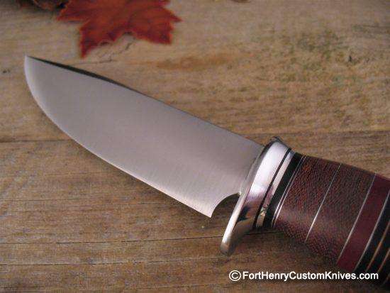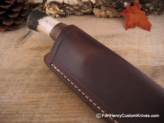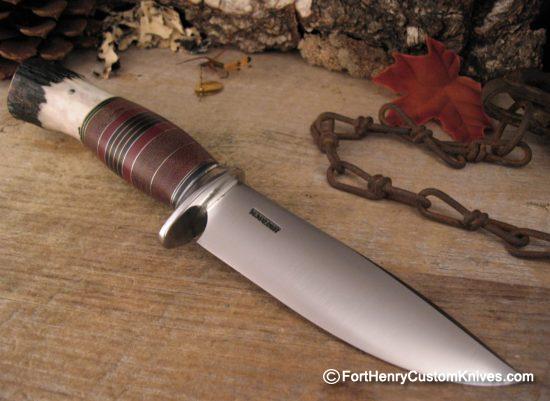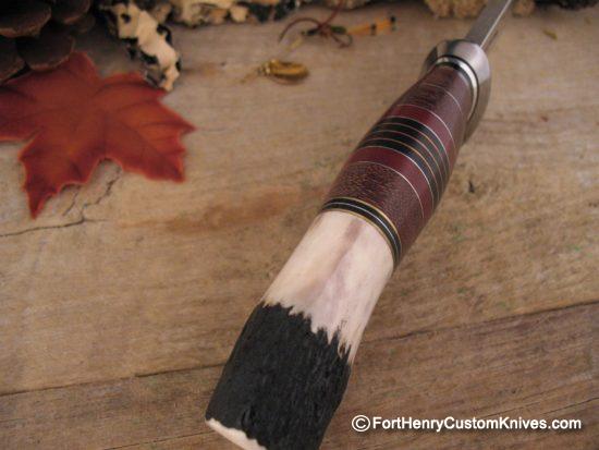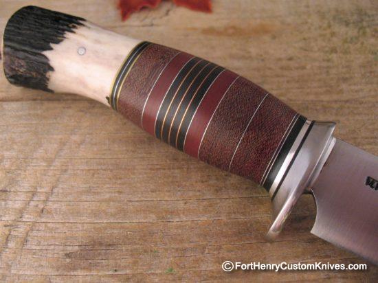 Gorgeous Sambar Stag Handle and Custom Stacked Leather Handle with alternating Aluminum, Burgundy & Black G-10 and Copper Spacers. Mike takes great care to Contour his handles for a Very Comfortable and Secure Grip.