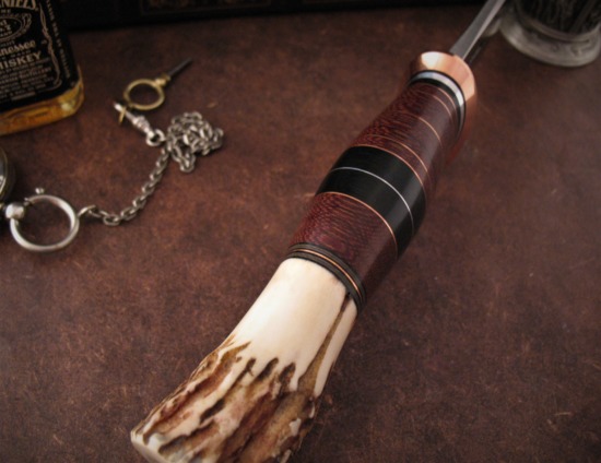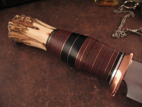 Sambar Stag Butt with a Custom Contoured “Scagel Style” handle and Rare Copper Guard.  The handle consists of Thick Stacked Natural Canvas Micarta & Black G-10 Spacers with alternating Custom Copper & Aluminum Spacers for a truly One of a Kind piece.