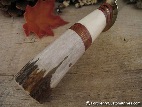 Beautiful Sambar Stag handle with custom ordered Copper, Brass and Black Micarta spacers for a very unique look.  Wonderful, Gnarly Sambar Stag butt cap.