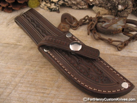 Comes with a Right hand Jack Mosher Tooled Leather belt sheath, Stainless Rivets and Stitched.