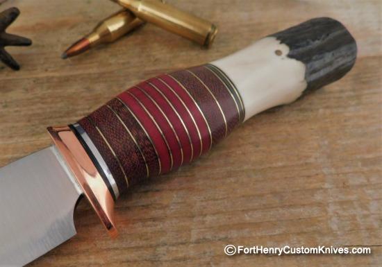 Wonderful, Full Grip Handle with Aluminum, Brass, Natural & Red Micarta spacers for a very unique look. Mike has Custom Contoured the handle for a very comfortable and secure Grip. The Custom Copper Finger Guard will insure the knife stays securely in your palm.