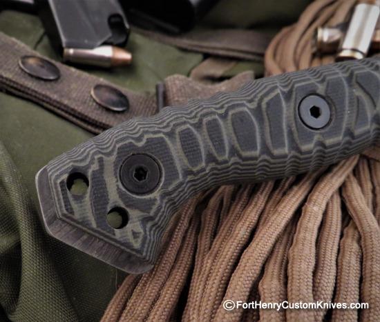 The Custom Hand Sculpted G-10 Handle Scales provides maximum strength with Traction Ridges to channel Dirt and Liquid around the entire Perimeter.