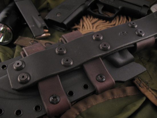 Even the Custom Belt Sheath is built for Extreme Duty, starting with a Thick Custom Molded Kydex Base with Infinite Hole Carry options built around the Perimeter, and then adding a Thick Custom Leather Drop Leg Attachment that can be Moved or Removed.