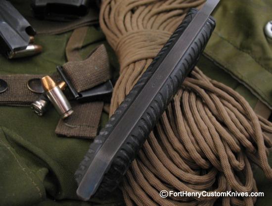 With one of the toughest Blades I have seen on a Fixed Blade – an Oversized .275 Thick, Cryogenically Treated Z-Wear PM Steel Blade ~ this is a Full Tang Beast that will Tackle ANY Cutting or Chopping Chore. *If you examine the picture below closely, you can see the word CUSTOM engraved into the Tang.