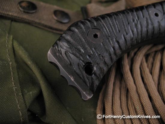 The Custom Hand Sculpted G-10 Handle Scales provides maximum strength with Traction Ridges to channel Dirt and Liquid around the entire Perimeter.
