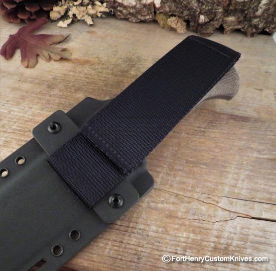 This example has Belt Sanded Green Micarta handle scales with Deep Contouring for maximum grip comfort and safety. It has a Forward Lanyard Hole as used in Competition cutting and a Hidden Rear Lanyard Hole.
