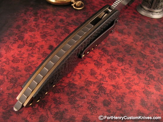 This is a Full Size Custom Nitro by Peter Carey, a sleek yet tough Liner lock that was precision crafted with a thick Anodized Titanium frame and Matching Lightening Strike Carbon Fiber scales.