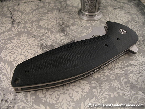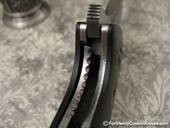 The Thick Black G-10 Backspacer has deep Traction Ridges. The Thick Orange Peel Ti Liners really stand out against the Black G-10.