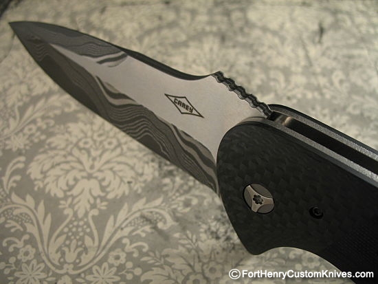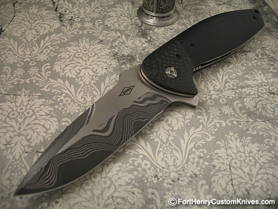 The Stainless Damascus Blade has a CPM154 Core and though the blade is BIG it Leaps open with absolutely impeccable movement, no wrist action needed. The Carbon Fiber Bolster is precision milled to fit the G-10 Handle scale – you cannot even feel the seam!