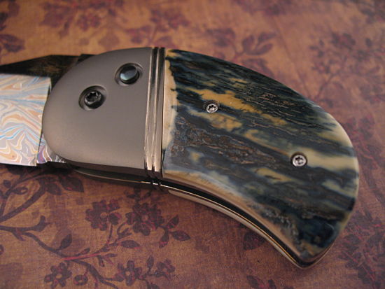 This model has Gorgeous Blue Mammoth Ivory handles and thick Titanium Integral Bolsters
