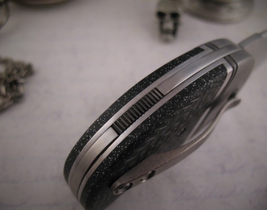 This Custom Model has Gorgeous Black/Silver Lightening Strike Carbon Fiber Scales with an Orange Peeled Stainless Steel Bolster.