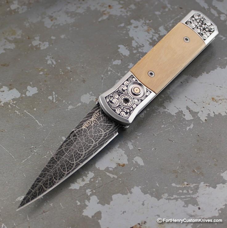 The Godson Ultimate Custom has a beautiful, razor-sharp Eggerling Damascus blade. Along with that are some unique Mastodon Ivory inlays.