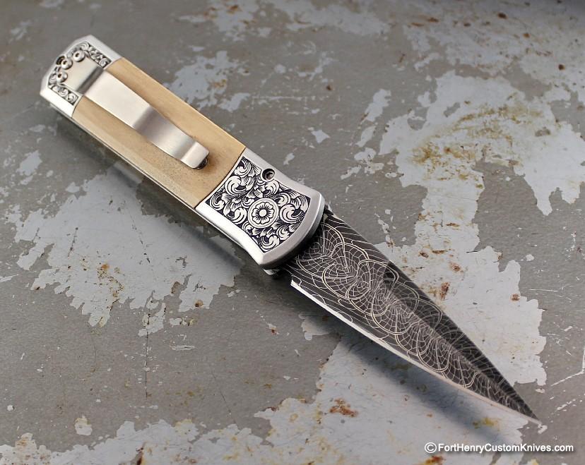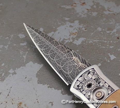 The Spear Point style blade does wonders for the overall appearance of this Elegant automatic. Accompanied by 416 stainless steel that’s been Hand Engraved by Bruce Shaw.