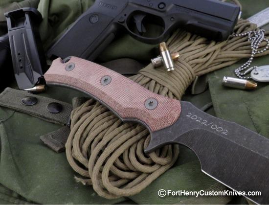 The Natural Canvas Micarta handle has a Bead Blasted finish that gives it a slightly grippy surface. The Thong Hole is located on the Top of the Butt to allow for secure lashing of the knife to your wrist. This one is Serial #02 with Ramon’s Signature on the blade.