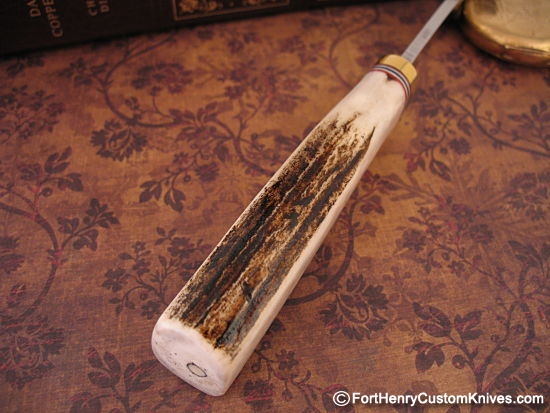 This example has a Beautiful Sambar Stag handle with Flattened Sides and dark Gnarly Bark ~ on the top and bottom of the handle.