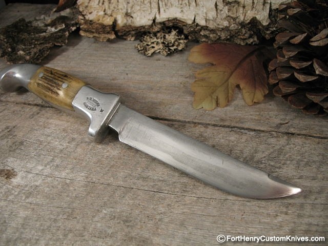 FAT Elk Antler inserts show Great color almost no shrinkage. This knife has been used but it still has the original Grind marks from Rudy’s stones. Some dings on the pommel area and the front of the guard. The Guard area where the Aluminum melds to the tang of the knife is especially well done.
